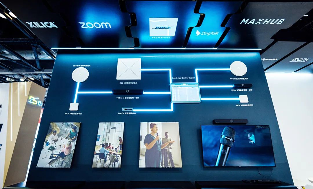 在展臺的核心區(qū)域,森海塞爾通過拓撲圖的形式,直觀且生動地展示了森海塞爾音頻解決方案的完整生態(tài)系統(tǒng):通過TCC 2和TCC M天花陣列麥克風(fēng)來滿足不同規(guī)模的會議空間需求,以TC Bars智能音視頻一體機為核心進行信號處理和交換。該系統(tǒng)還可以無縫集成森海塞爾EW-DX無線數(shù)字麥克風(fēng)系統(tǒng)和Speechline數(shù)字無線系列等產(chǎn)品。