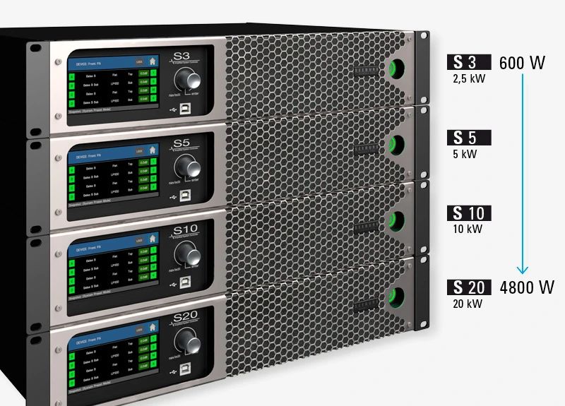 最后不得不提的就是這套定制“核潛艇”電音系統(tǒng)的驅(qū)動功放,同樣是由同廠推薦的四通道系統(tǒng)DSP功放S10/S20:4×4800W/4Ω(高達(dá)近兩萬瓦)的高功率低失真輸出,S系列的4通道放大系統(tǒng)控制器將最先進(jìn)的電力電子設(shè)備與先進(jìn)的DSP相結(jié)合,可以通過觸摸顯示屏方便地進(jìn)行操作。其智能功率共享功能確保在驅(qū)動不對稱負(fù)載時非常有效地使用可用功率。根據(jù)AES 67標(biāo)準(zhǔn),可通過GPIO和以太網(wǎng)音頻(AoE)進(jìn)行擴(kuò)展。