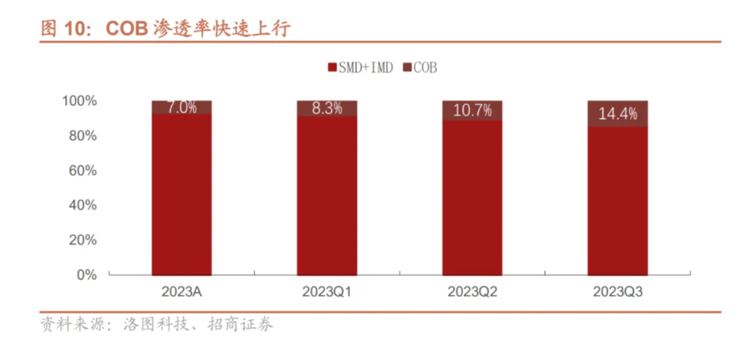 至2023年以來, COB LED顯示應(yīng)用產(chǎn)品競爭力、市場口碑和品牌價值得到空前發(fā)展,2023年也被業(yè)內(nèi)人士認(rèn)為是COB LED顯示的爆發(fā)元年。根據(jù)洛圖統(tǒng)計數(shù)據(jù),在全國小間距LED顯示屏產(chǎn)品(P2.5 及以下間距)中,三季度COB產(chǎn)品出貨面積同比增長近2.5倍,銷售金額滲透率達(dá)到14.4%,同比提升7.8pct,較Q1/Q2的8.3%和10.7%也有明顯加速滲透趨勢。