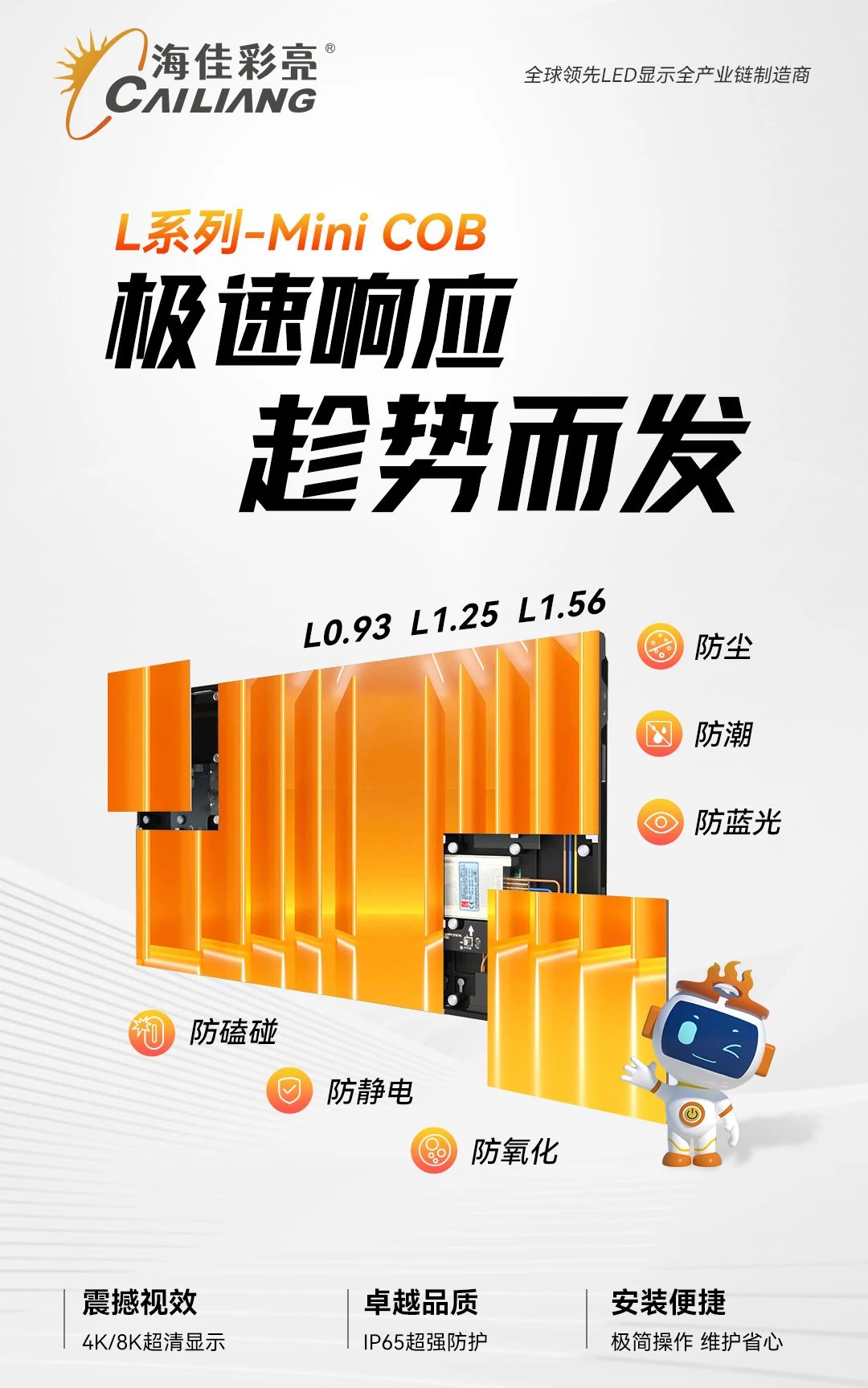 海佳彩亮L系列-MiniCOB產(chǎn)品采用納米覆膜工藝,可在COB模塊表面涂覆一層高分子納米薄膜,使其具備防水防撞功能,特殊材質(zhì)的覆膜也可大大提升COB模塊墨色的一致性,從而提升產(chǎn)品對比度。同時具有耐用、高穩(wěn)定性、高防護(hù)、無限拼接等技術(shù)優(yōu)勢,再契合8K超高清顯示的發(fā)展趨勢,將顯著提升室內(nèi)顯示如監(jiān)控室, 會議室, 教育空間的視覺體驗。