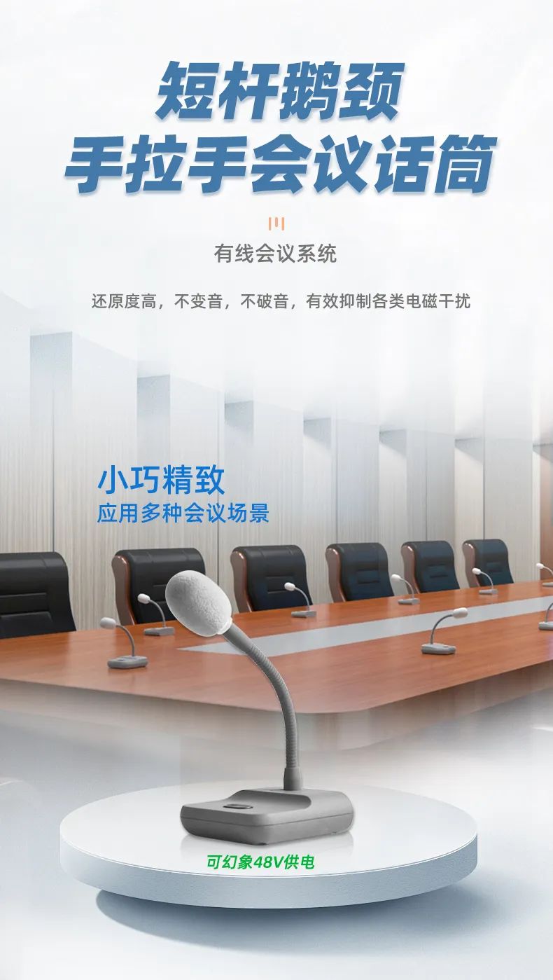 新研發(fā)的短桿鵝頸話筒是一款闊頻寬的專業(yè)高保真電容咪芯話筒,話筒采用短咪桿鵝頸式話筒、高靈敏度設(shè)計(jì),外觀簡(jiǎn)潔大氣。話筒咪芯部分采用橡膠避震材料,使其盡可能的避免了臺(tái)面噪聲對(duì)話筒拾音的影響。話筒外觀造型上采用金屬氧化面板,簡(jiǎn)潔硬朗的外觀設(shè)計(jì)表現(xiàn)出簡(jiǎn)約莊重風(fēng)格。此會(huì)議話筒專門服務(wù)于高端會(huì)議市場(chǎng),設(shè)計(jì)于增強(qiáng)拾音、專業(yè)錄音、電視廣播、會(huì)議等高要求的拾音應(yīng)用場(chǎng)所。