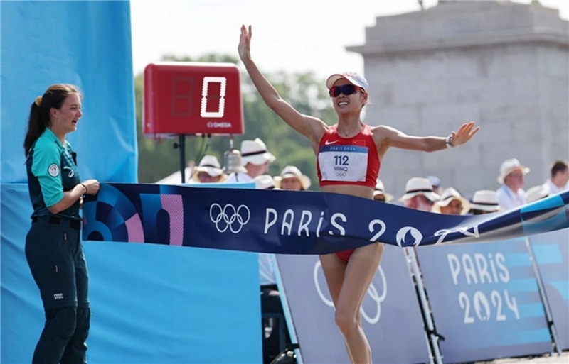 8月1日,楊家玉向終點沖刺。當日,在巴黎奧運會女子20公里競走比賽中,中國選手楊家玉奪得冠軍。新華社記者 李鋼 攝(裁切前)