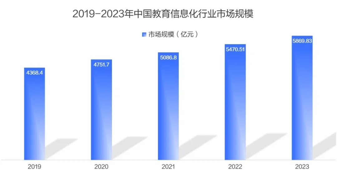 隨著學(xué)校、家庭對(duì)教育質(zhì)量認(rèn)知的深刻轉(zhuǎn)變及消費(fèi)偏好的高端化演進(jìn),教育智能硬件市場迎來了前所未有的發(fā)展機(jī)遇,需求量井噴。在此背景下,教育智能硬件市場呈現(xiàn)出爆發(fā)式增長態(tài)勢。據(jù)權(quán)威數(shù)據(jù)分析,2019年至2023年期間,中國教育信息化市場規(guī)模從4368.4億元增長至5869.83億元,年均增速超7%。當(dāng)前,我國教育信息化市場仍存在尚未被滿足的需求,行業(yè)市場容量已接近萬億級(jí)別。