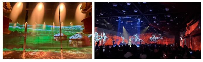 《昭君出塞》紗幕投影(左);三樓劇場四面舞臺(tái)上的沉浸式視覺效果(右)。