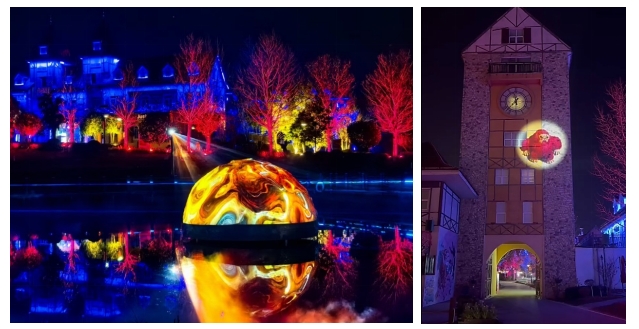 “依欄問(wèn)月”球幕投影(左)和“鐘樓幻境”投影展示(右)由科視Inspire 系列投影機(jī)打造