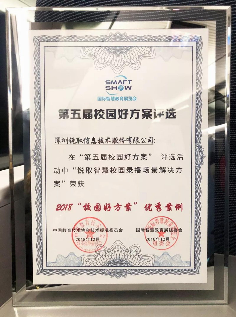在SmartShow第五屆校園好方案評選活動中,銳取——智慧校園全場景錄播解決方案,經(jīng)中國教育技術(shù)協(xié)會教育測量與評價專業(yè)委員會評審,從七百多個參選方案中脫穎而出,躋身百強,獲“優(yōu)秀方案”榮譽!第五屆校園好方案評選活動,旨在甄選百城千校認可的標桿型方案,推動“教育+技術(shù)”的進化變革,是國內(nèi)首個以用戶使用角度為評定標準的教育信息化解決方案評選。榮譽時刻 獲權(quán)威機構(gòu)雙重認可12月9日,2018國際教育信息化峰會暨國際智慧教育展覽會第二日,第五屆校園好方案評選頒獎儀式在北京國家會議中心隆重召開。中國教育技術(shù)協(xié)會常務(wù)副會長張少剛、中國教育技術(shù)協(xié)會副會長兼秘書長丁新、中國教育技術(shù)協(xié)會副會長鐘曉流等領(lǐng)導(dǎo)嘉賓