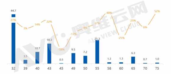 32"出貨量達(dá)到44.7M,同比增長(zhǎng)27%,主要原因是世界杯備貨主要目標(biāo)區(qū)域仍以小尺寸為主,同時(shí)國(guó)內(nèi)市場(chǎng)32"隨著智能化提升降速有所緩解,供應(yīng)端來(lái)看8.6代線(xiàn)爬坡以及8.5代線(xiàn)套切也增加了32"的供應(yīng)。