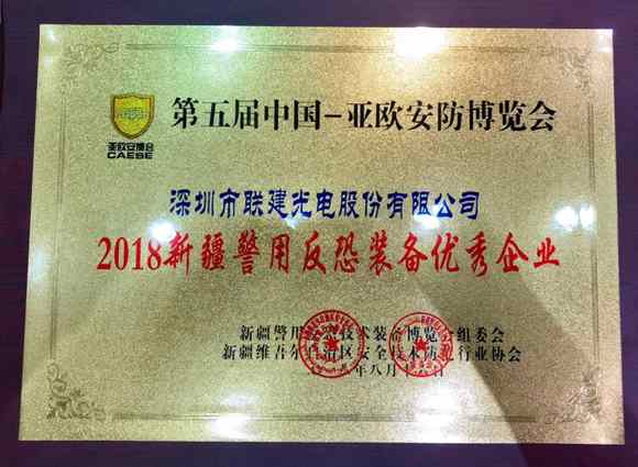 展會期間,聯(lián)建光電斬獲2018新疆警用反恐裝備優(yōu)秀企業(yè)獎。
