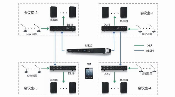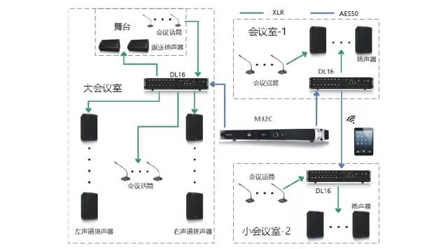 M32C具有雙AES50網(wǎng)絡(luò)接口,最大可擴展到96個輸入和96個輸出。根據(jù)會議室音頻信號的傳輸通道需求,可將DL16/DL32分別配接在兩個不同的會議室,僅通過兩根cat5類網(wǎng)線便能實現(xiàn)兩個會議室的集中控制。通過ipad等應(yīng)用軟件進行混音和信號分配,并且M32C允許多臺應(yīng)用設(shè)備接入控制,可用兩個ipad分別控制兩個會議室。M32C前面板配備A類USB插口用于音頻和數(shù)據(jù)傳輸,可實現(xiàn)會議錄音功能,導出導入wav音頻格式文件。