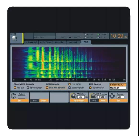 M32C內(nèi)置一個高精度的100段實時頻譜分析儀,而且可以在M32-EDIT軟件.上顯示出來。這個高精度的實時頻譜分析儀可以顯示100段的頻率隨時間變化的能量分布一每10秒窗口就捕捉一-次聲波。RTA的顯示窗[可以獨立顯示任意一個信號,也可以顯示所有通道信號以及母線的EQ曲線,還可以直接觀察濾波器的頻譜。讓你更直觀的觀察和控制頻譜均衡量。